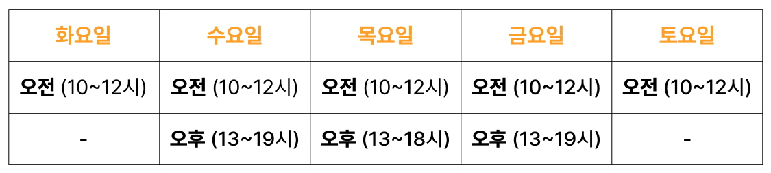 - 신청 가능 시간은 다음과 같으며, 센터 운영 상황에 따라 사전에 일정 협의가 필요합니다.